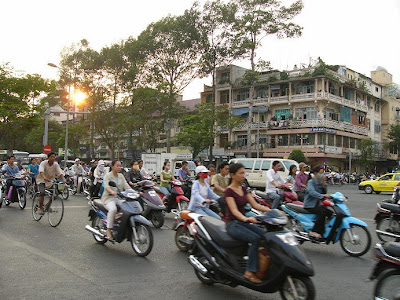 there were few traffic lights for pedestrians in ho chi minh city, so if you wanted to go the other side of the road, it would be murderous. shion and i at first had to wait till some local people crossed the road. we later got used to it a bit and did cross over by ourselves, though. frankly, we got tired of the hustle bustle a little. our hotel room, overlooking the saigon river, was situated opposite the lamppost with a public speaker, from which some loud voices came every single morning at, i guess, 6 am. the rush hour started incredibly early in the morning in ho chi minh city. we had no clue what it was for or what was announced.