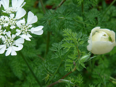 the bluebell season looked nearly over when i had a walk yesterday. still, i could enjoy sort of a residue of the english spring image. i sometimes spotted a white variant in london. in fact, i’m always attracted to white or greenish flowers. along with bluebells, clearly green hellebore also passed their prime, however. now that white lace flowers (orlaya grandiflora) must be the queens of the garden in my park. there were other whites such as tulips and 姫空木 hime-utsugi (deutzia gracilis). if you took a closer look at flowers, you would find tiny green creatures like a spider and a grasshopper busy working on them. despite the fact that i have a terrible arachno-phobia, that was another lovely discovery!