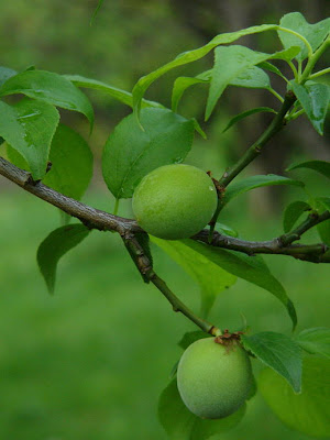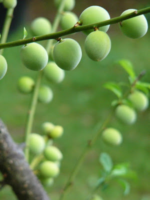 trees were beautiful, too. 花水木 hanamizuki (dogwood) can never be an eye-opener, but it brightened up the path in woodlands. do you remember my post on 梅 woo-may (prunus mume) blossom back in february? when i walked through the 梅 orchard, i saw swelling green fruits on the branches already rounding. and, what about the post on burning 紅葉momiji? lacy soft green leaves, trembling to the breeze, now made me a green canopy while walking up to the main path. then, on my way home, i found that each 柊南天 hiiragi-nannten (mahonia japonica) in the shrub near my flat had dozens of fruits, which exactly look like gems of jade.